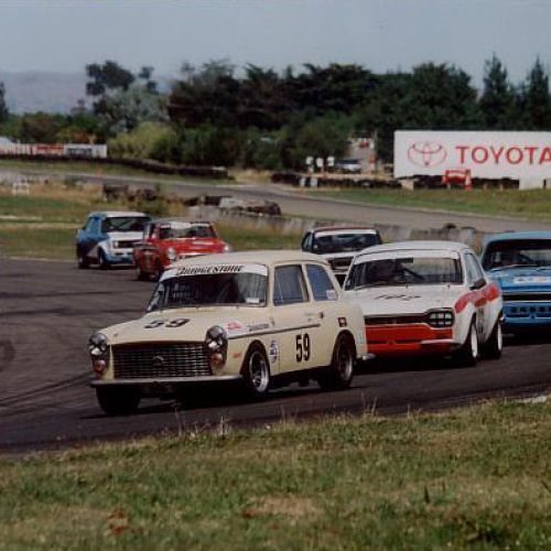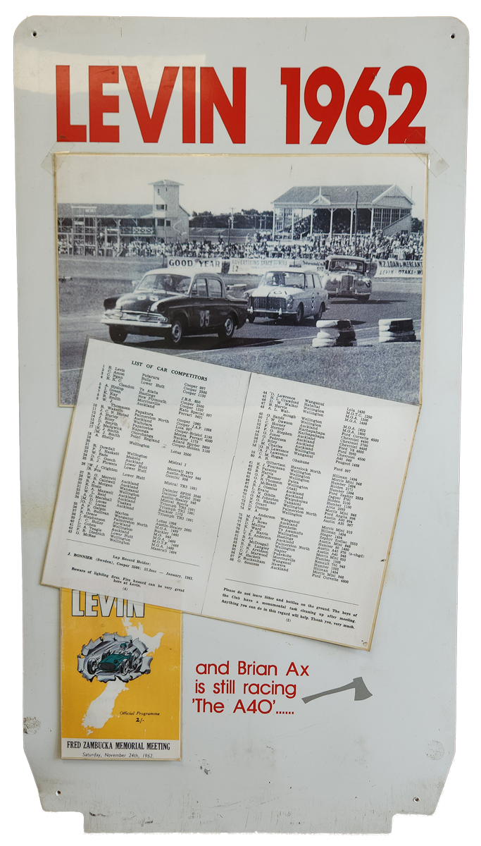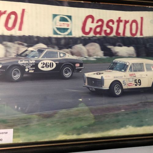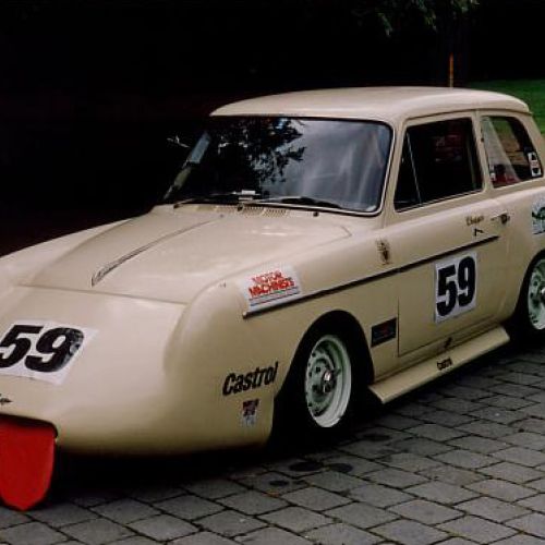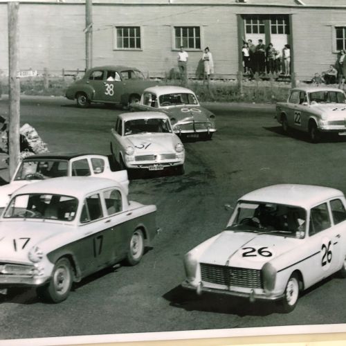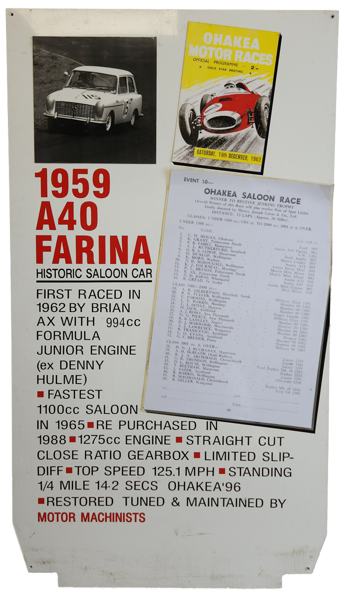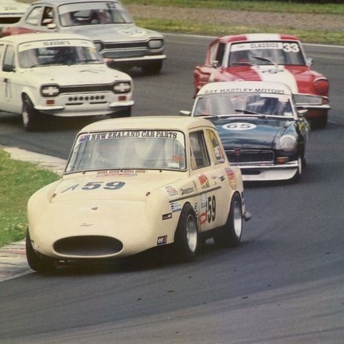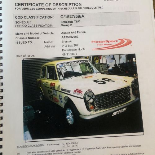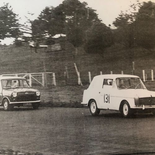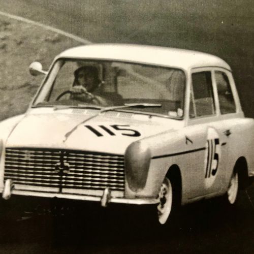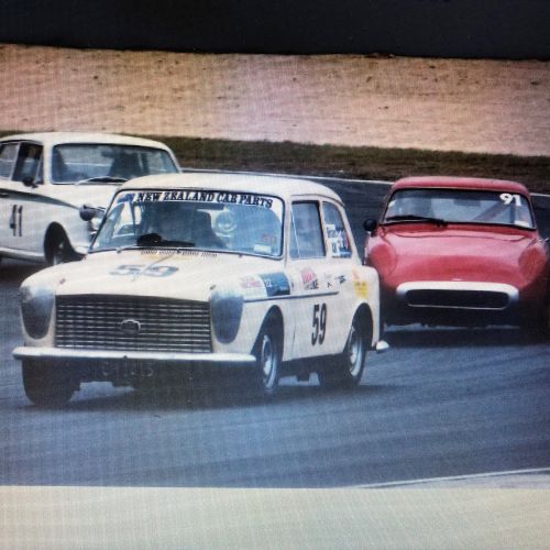 First registered 6/11/1959 by Beaumont Stores, Lower Hutt. First purchased by Brian 15/05/1962 and is still road registered (on hold). First raced at Levin Motor Racing Circuit in 1962. The engine was a bored out +60 to 998cc BMC 648 camshaft, close ratio gearbox and limited slip differential. A very competitive car under 1000cc running second to the grey and black A40 Farina of Kerry Grant with a FJ motor from the ex Denny Hulme Former Junior Cooper.