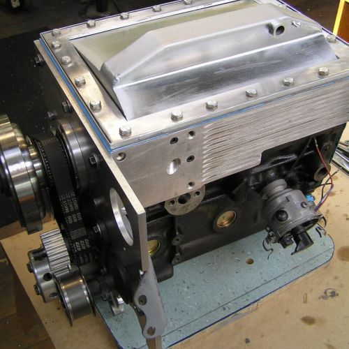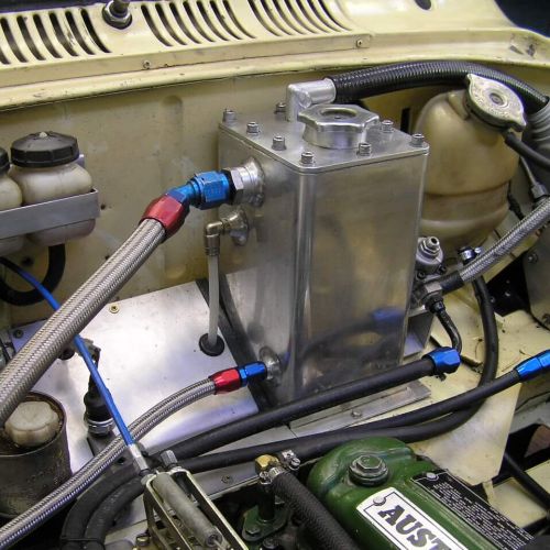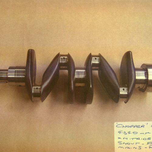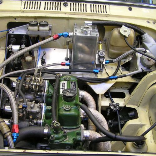 I raced this in club events with the CDCCC for a few years – the desire for more performance begins. Firstly, I made a stroker crankshaft with a 92mm stroke to give 1585cc. The high tensile 4340 crankshaft complete with a large diameter front snout, rear thrust main bearing and neoprene crankshaft oil seal. This was knifed and aerofoiled, stress relieved, shot peened, nitrided and balanced with a high tensile 4340 light weight flywheel complete with an AP pressure plate with a disc clutch plate and modified, lightened and heat treated Cooper S conrods. A 7 series alloy heat treated main bearing girdle complete with 4 bolt mains, an alloy dry sump manufactured using Austin A110 rotor parts, this was bolted to the girdle plate and cog built driven with the oil pump, water pump, camshaft balancer gear and crankshaft with a windage tray and filtered sump pan. 10” alloy finned drums fitted with ducted air cooled. Fitted with alloy racing fuel tank and fitted with a Triumph 2.5 fuel injection pump to pump water/methanol mist to the carburetors. This is electronically monitored to come in at 3500rpm.